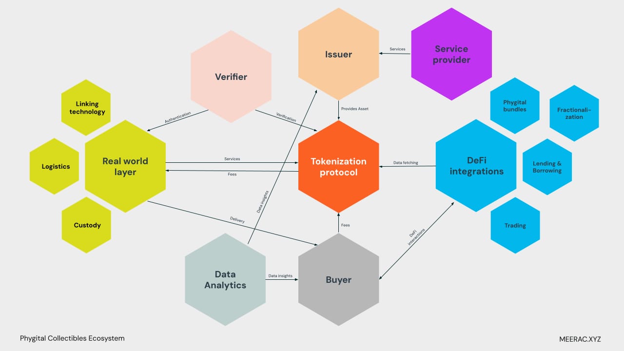This vibrant ecosystem represents a blend of blockchain's interoperability, transparency, and innovation with tangible real-world assets. The vitality and successful operation of this ecosystem hinges on the smooth interaction among a multitude of crucial stakeholders: tokenization protocols, issuers, service providers, verifiers, custody providers, DeFi platforms, and data analytics tools. Each plays a critical role in nurturing a safe, reliable, and fruitful environment for phygital collectibles to thrive.